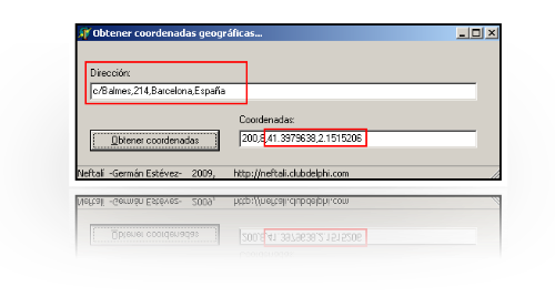 procedure TForm1.btn1Click(Sender: TObject); const STR_WEB = 'http://maps.google.com/maps/geo?q='; STR_OUT = '&output=csv'; // formato de salida var Stream: TStringStream; Str, res:string; begin // ini Stream := TStringStream.Create(''); // proteccion para liberar try Str := STR_WEB + edt1.Text + STR_OUT; idhttp2.Get(Str, Stream); edt2.Text := Stream.DataString; finally FreeAndNil(Stream); end; end; |