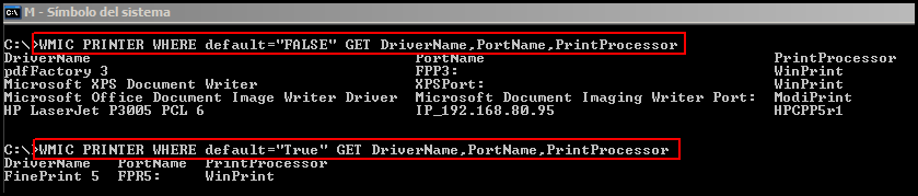 1 2 3 4 5 | WMIC PRINTER WHERE Default=”TRUE” (obtener info sobre la impresora predeterminada) WMIC PRINTER WHERE Default=”TRUE” LIST FULL WMIC PRINTER WHERE default="TRUE" GET DriverName,PortName,PrintProcessor (para obtener determinados datos de la impresora predeterminada) |