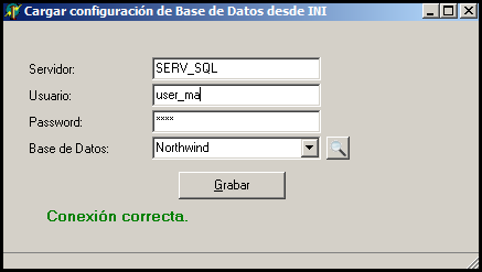 // Grabar ini.WriteString(CONFIG_SECTION, 'User', edtUser.Text); ini.WriteString(CONFIG_SECTION, 'password', edtPassword.Text); ini.WriteString(CONFIG_SECTION, 'Server', edtServer.Text); ini.WriteString(CONFIG_SECTION, 'BaseDatos', cbBD.Text); |